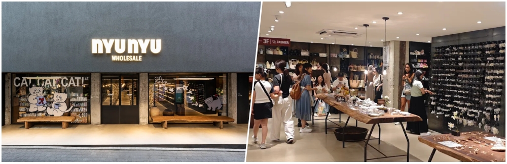 不用大半夜跑去東大門,明洞現在也有超大型的 Nyu Nyu 飾品店了。這裡有整整三層樓的飾品牆,從耳環、項鍊、髮夾到帽子、帆布包,款式多到讓人眼花撩亂。