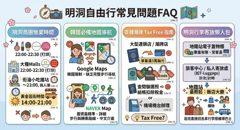 在規劃明洞行程時,總是會遇到一些繁雜的瑣事需要確認。為了解決大家在行程安排上的焦慮,我整理了幾個最多人在出發前會詢問的明洞自由行常見問題。無論是關於商圈的營業時間、免稅機制的運作,還是逛街時的行李寄放問題,這裡都會給你最直接、符合現狀的解答。