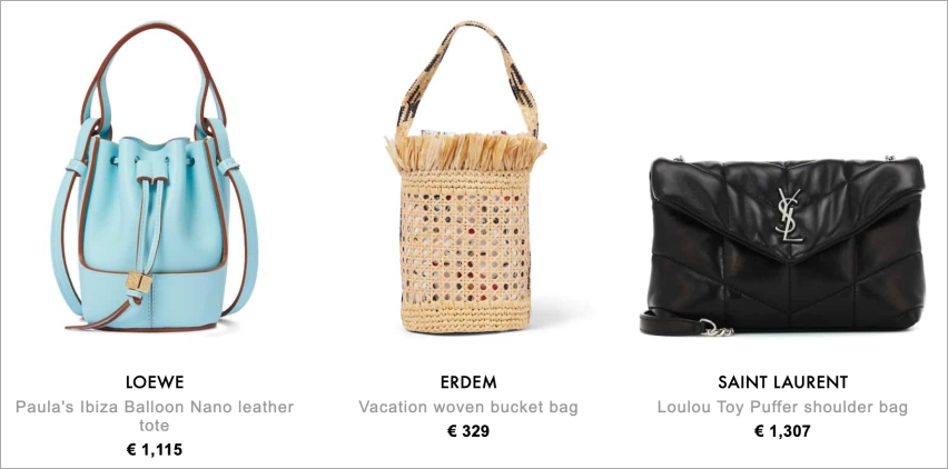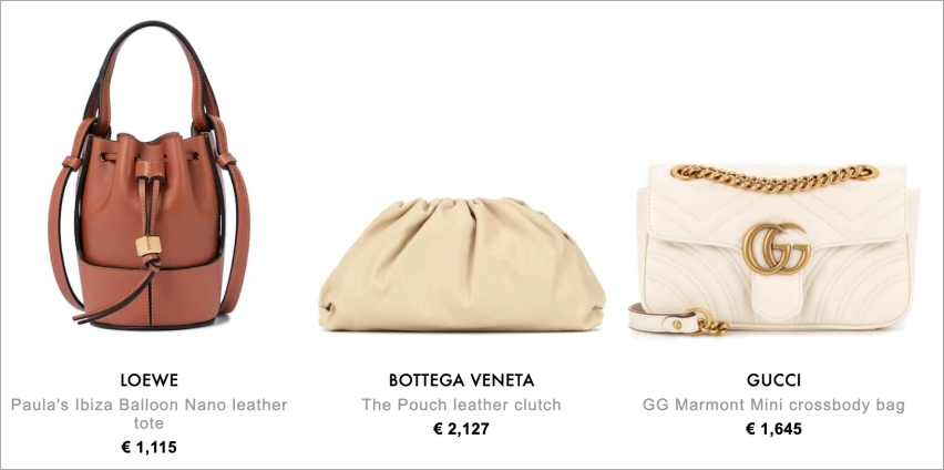 各類商品也會更加細分,例如包包區就有LOEWE、GUCCI、CHLOÉ、BURBERRY、BOTTEGA VENETA、JIMMY CHOO、ROGER VIVIER⋯等國際知名品牌的斜背包、單肩包、托特包、手提包、水桶包⋯還有最近大家很愛的迷你包也有專區。