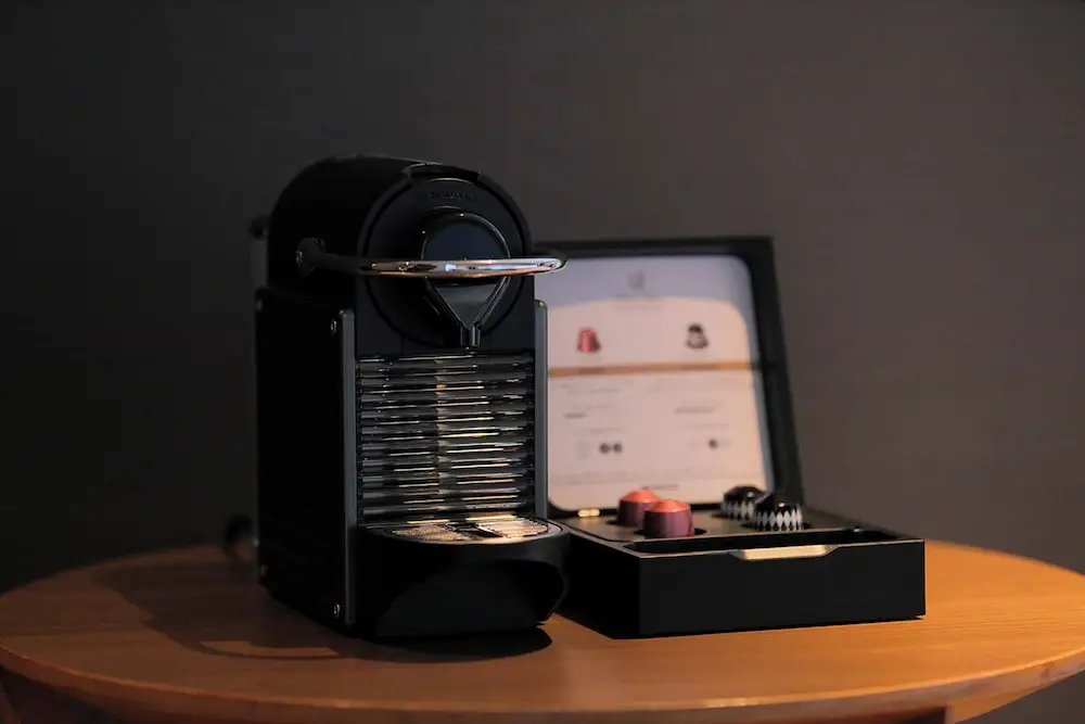 房間裡配備了膠囊咖啡機和很有質感的藍牙喇叭。我那時候連上手機,放著 Jazz,一邊喝咖啡一邊看著底下的新幹線像玩具一樣跑來跑去,真的覺得自己是日劇女主角。