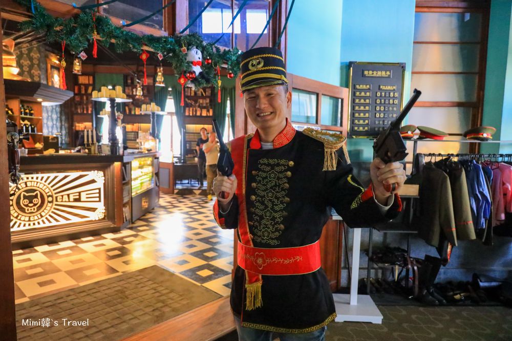 蘿西家族南投稅務出張所的二樓主要是蘿西咖啡廳,入口處準備了很多復古的服裝和道具(需付費),大家可以變身成大元帥、副官或是稅務人員到裡面拍照。