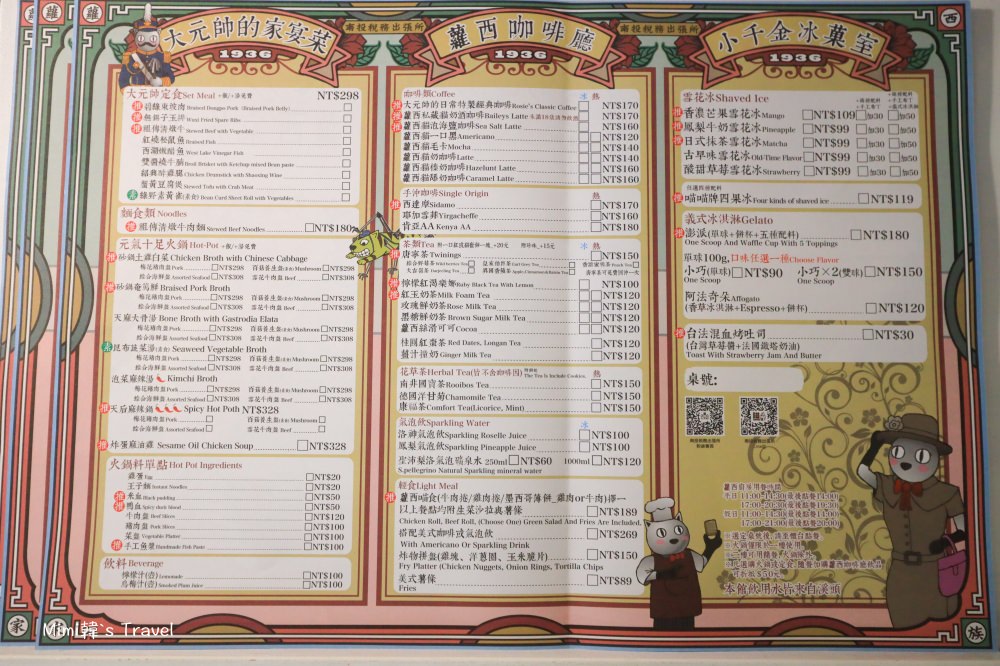 菜單給大家參考,整個蘿西家族南投稅務出張所中的三間餐廳都是共用這張菜單,基本上點餐應該是可以部份重疊的,像是咖啡廳裡也可以點定食,但如果想吃火鍋就只能到一樓的大元帥餐廳,大家可以先問一下再決定。