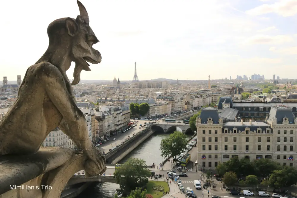 經歷千辛萬苦爬上來後的回報就是「怪獸走廊」(Galerie des Chimères)。那些表情猙獰的石像鬼近在咫尺,背景是艾菲爾鐵塔和蒙馬特聖心堂,這畫面絕對值回票價。不過要注意上面的走道也很窄,加上大家都在瘋狂拍照,常常會被擠到貼在牆上,想拍張沒有路人的網美照幾乎是不可能的任務。
