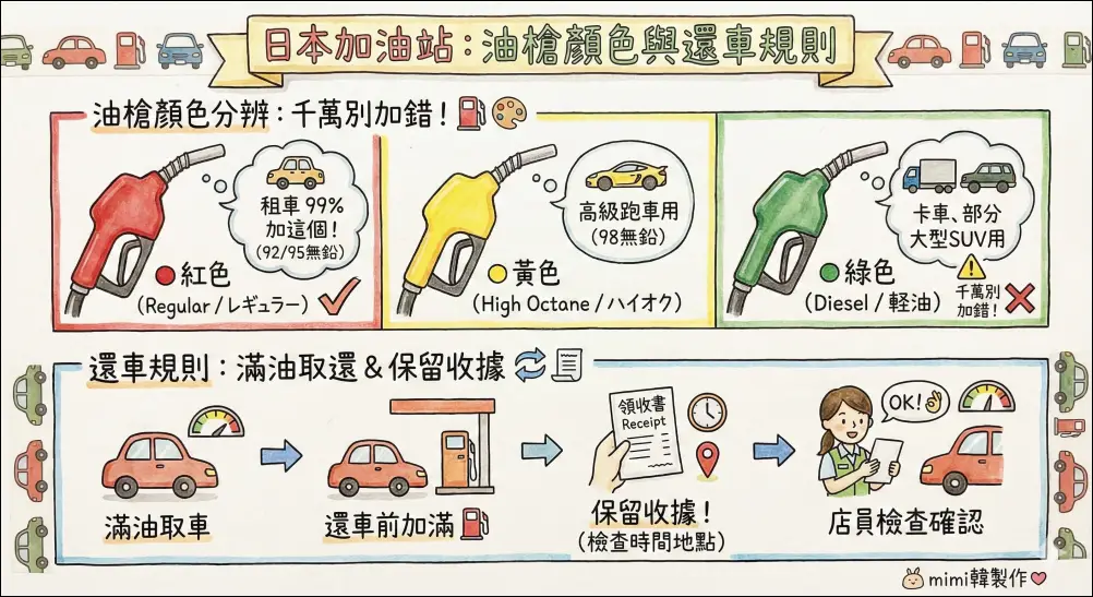 - 紅色:Regular (92/95無鉛) ➡ 租車 99% 都是加這個!