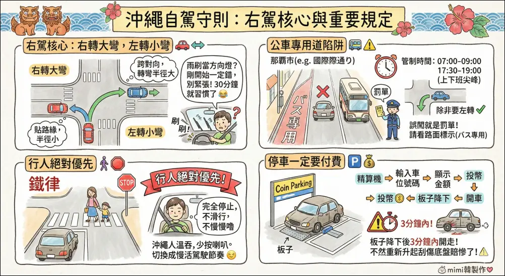 在異國右駕,視角盲區完全不同,加上沖繩很多路段路寬較窄,我看過太多案例是在飯店停車場「A到」柱子,或是轉彎時左後輪「騎上」路緣石或直接去擦撞電線桿。