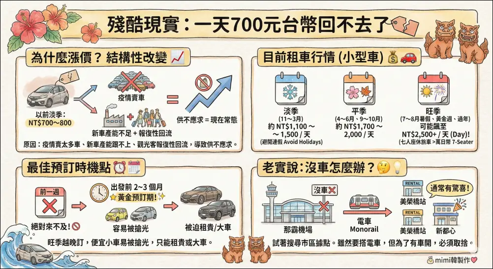 記得以前淡季去沖繩,一天台幣 700~800元就能租到一台Honda Fit嗎?目前真的很困難了,我覺得從2025年到現在的行情,價格已經發生了結構性改變。原因很簡單:疫情期間租車公司賣掉太多車,現在新車產能跟不上,加上觀光客報復性回流,「供不應求」價格偏高是現在的常態。