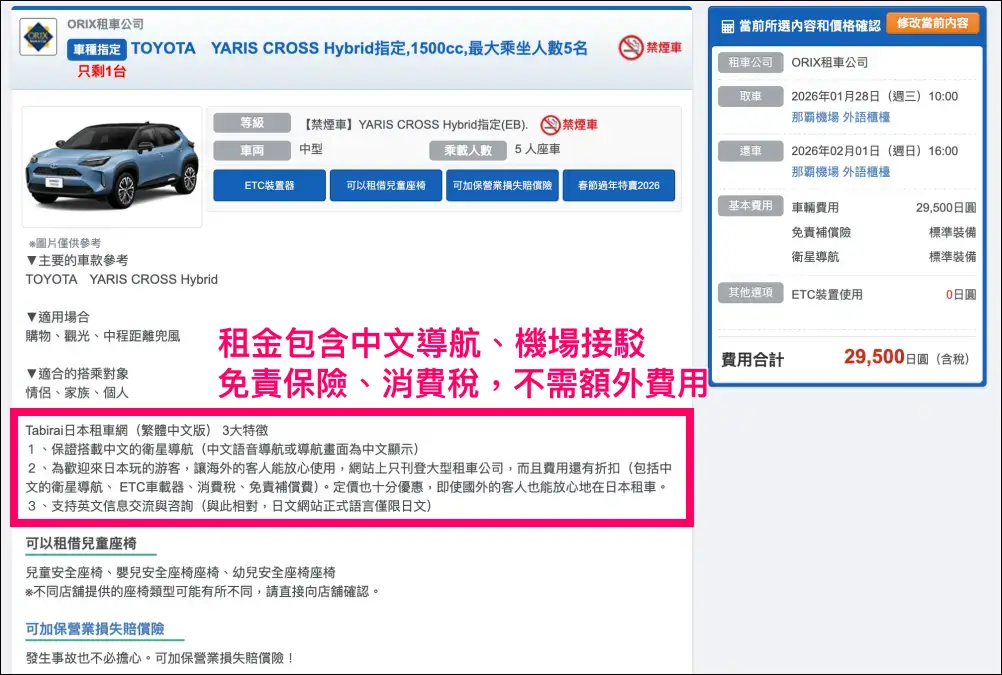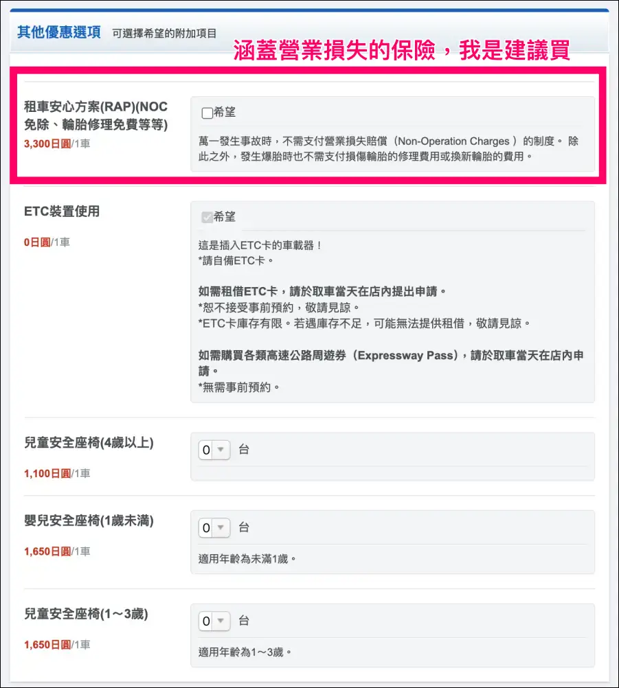 有需要兒童安全座椅,可以另外點選加購,提醒大家如果有小孩就一定要租唷!日本法律規定6歲以下的兒童坐在車上時,必須使用兒童安全座椅。