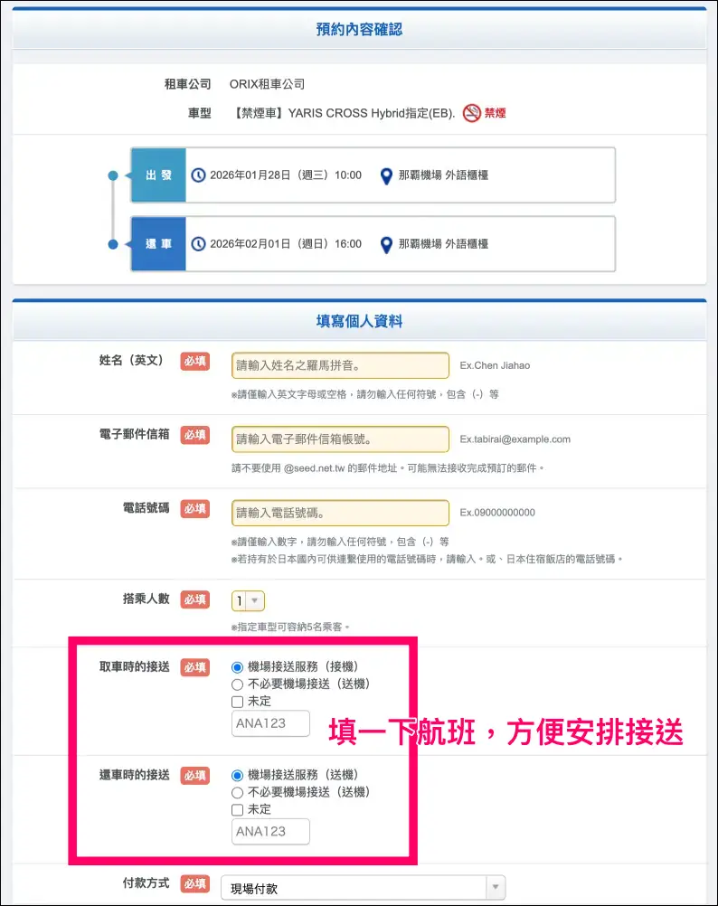 選好適合的車輛之後,繼續輸入個人資料,建議填寫航班編號,方便租車公司安排機場接送服務。以上就是怎麼既便宜又方便,快速搞定沖繩租車的方式。