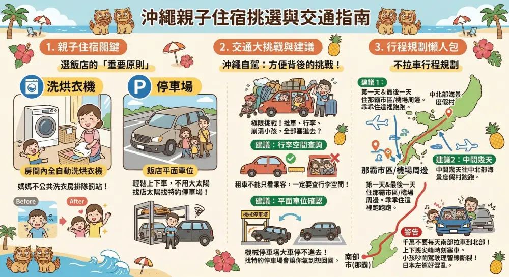 帶小孩到沖繩自由行,選對飯店真的能讓爸媽少折壽幾年。以前找沖繩親子住宿,只要看到有溜滑梯或兒童泳池就馬上腦波弱下訂。但在經歷過無數次幫小孩洗髒衣服、在市區塞車找停車位的崩潰後,我發現真正的適合親子旅遊的好飯店最好具備「房內自帶洗烘衣機」、「方便好停的車位」或是「樓下就能買東西」等神級實用條件。