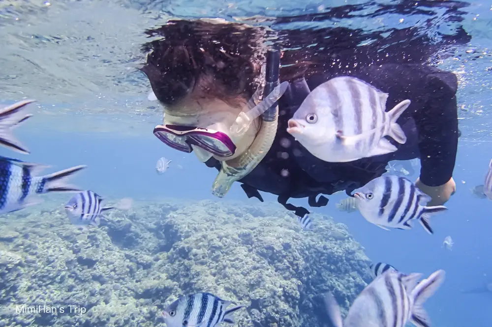 帶小孩下水,找潛店真的不能貪小便宜。建議一定要找有提供「中文教練」跟「保姆式服務」的店家。有些細心的教練會準備透明觀景桶,讓不敢戴面鏡的小小孩也能趴在水面看魚,這招對怕水的孩子超有用。教練比例絕對要控制在 1:3 或 1:4 內,確保教練的手隨時拉得到你的孩子。
