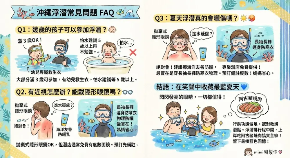 總結來說,帶孩子浮潛,考驗的其實是爸媽的耐心。說實話,只要行前功課做足,選對教練跟潛點,看到孩子拿下面罩時那雙閃閃發亮的眼睛,你就會覺得打包行李的辛苦都值得了。強烈建議把浮潛排在行程的中間,給孩子一兩天適應沖繩的步調,上岸後再去吃頓銷魂的阿古豬燒肉犒賞全家。希望這份攻略能幫你們家留下最棒的藍色回憶!
