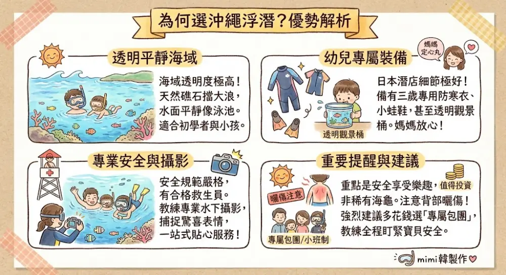 另外,沖繩的安全規範非常嚴格,熱門潛點通常都有合格救生員。最讓媽媽心動的,絕對是「專業水下攝影服務」,教練會拿著防水相機幫全家人狂按快門。不用自己手忙腳亂拿手機怕進水,還能捕捉到孩子看到魚群時的驚喜表情,這種一站式的貼心服務,真的是帶小孩出門的完美救星。