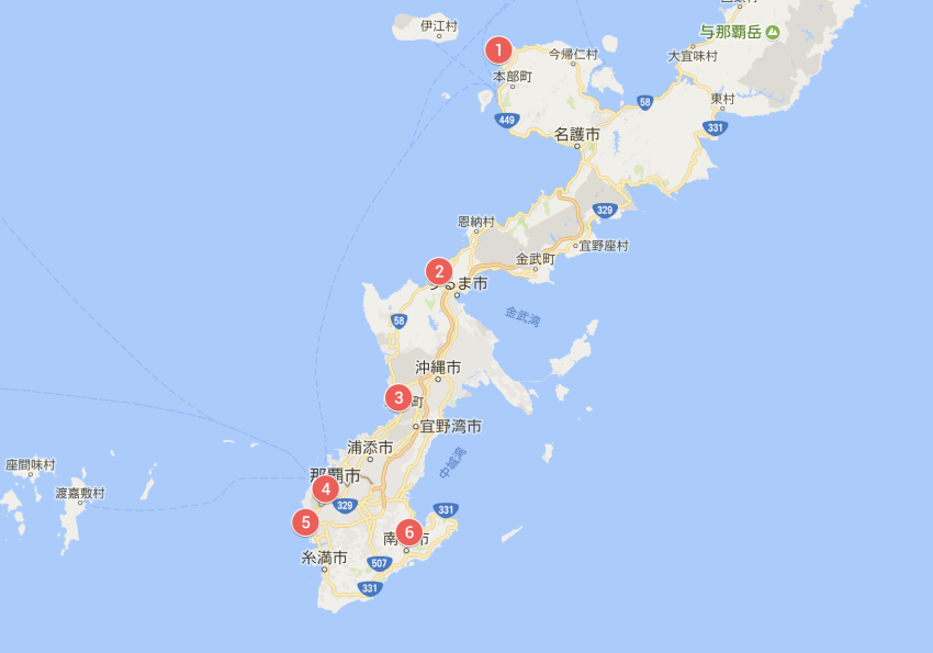 簡單畫個地圖給大家參考,原則上這篇選擇的沖繩溫泉住宿飯店都是位於大家常去的那霸國際通、美國村、恩納和名護等地點,編號可以自己比對,滿建議可以第一天先訂北邊的飯店,然後再慢慢玩回那霸市,最後一天晚上在國際通血拼隔天去機場剛好 😆