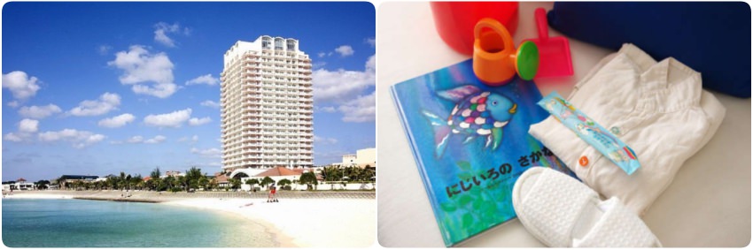 雖然飯店設備不新穎,但房間很大,陽台就有是無敵海景,外面是海灘,有提供簡易的玩沙工具給小朋友。如果帶嬰兒同行,建議可以預約家庭房,會收到一張禮券來兌換兒童禮包,裏面有奶粉、尿布和餅乾,我覺得是各方面都很棒的沖繩住宿,冬天來住也很適合。