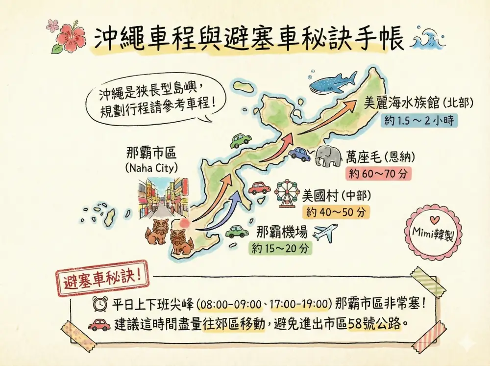 避塞車秘訣: 平日上下班尖峰 (08:00-09:00、17:00-19:00) 那霸市區非常塞,建議這時間盡量往郊區移動,不要進出市區58號公路。