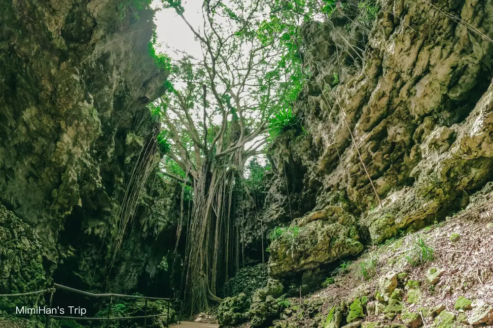 逛完玉泉洞先別急著開車離開,出口對面的「ガンガラーの谷(Valley of Gangala)」絕對值得走一遭。這裡面隱藏著一間非常有特色的洞穴咖啡廳(Cave Cafe),直接在巨大的鐘乳石山洞裡擺上桌椅,氣氛極佳,而且洞穴內非常涼爽,完美拯救了剛從玉泉洞出來熱到崩潰的身體。
