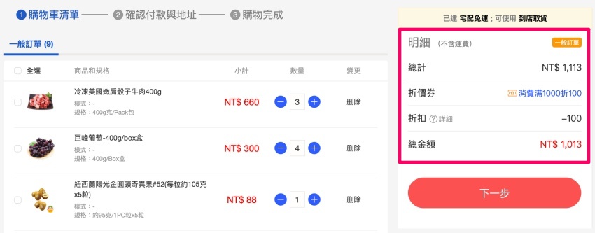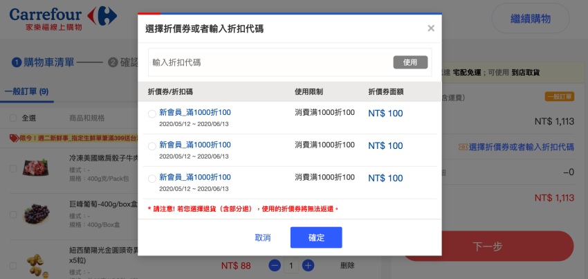 步驟二:購物車中會看到”選擇折價券或輸入折扣代碼“的欄位,點選使用即可,例如Mimi就使用了新會員滿1000折100的折扣券。