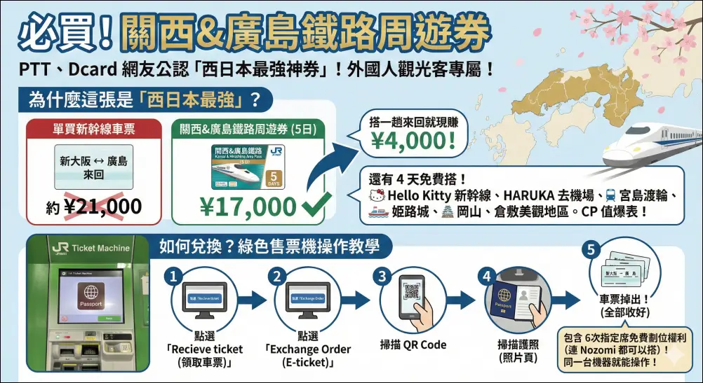 這張關西&廣島地區鐵路周遊券是PTT、Dcard 網友公認的 「西日本最強神券」,非常適合用來跨縣市玩,如果你是拿觀光簽證的外國人,拜託直接買這張,不要單買新幹線車票!