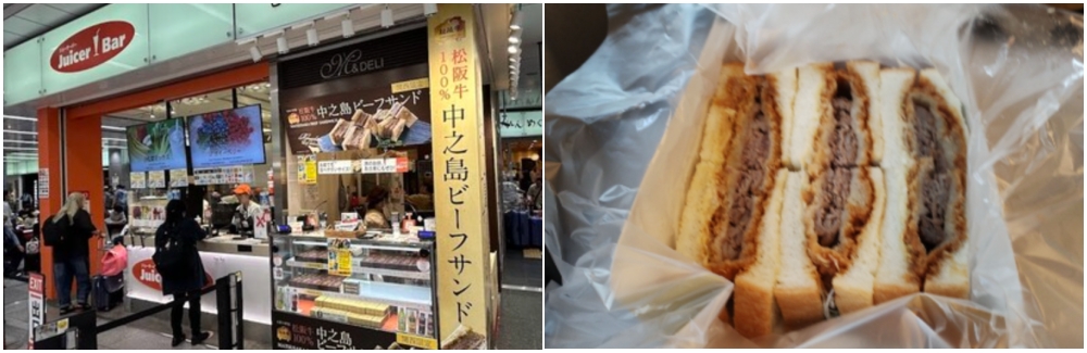 在新大阪站,絕對不能錯過 「551 HORAI 蓬萊肉包」,這是大阪的靈魂美食,皮厚Q彈,內餡多汁。不過說真的 551 的肉包味道非常濃郁,在新幹線上吃好像有點不道德哈哈,可以的話就儘量在月台吃完再上車。不然去買「中之島炸牛排三明治」也是絕品,冷掉也好吃,配啤酒一絕,很多日本人也都會買這個。