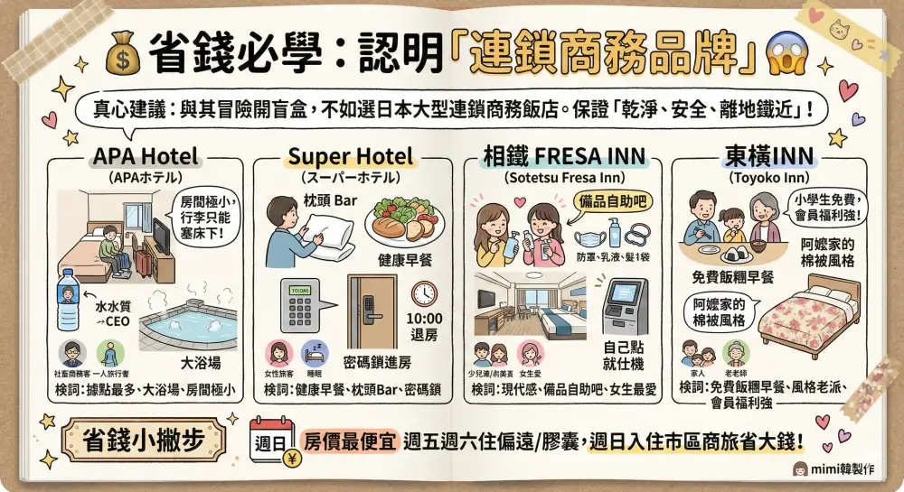 為什麼?因為這些集團有強大的 SOP,雖然給不了你驚喜,但絕對能保證「乾淨」、「安全」且「離地鐵近」。而且它們通常都有特定的強項(例如免費早餐或大浴場)。以下是我住過無數次後,針對大阪常見四大平價品牌的真實分析:
