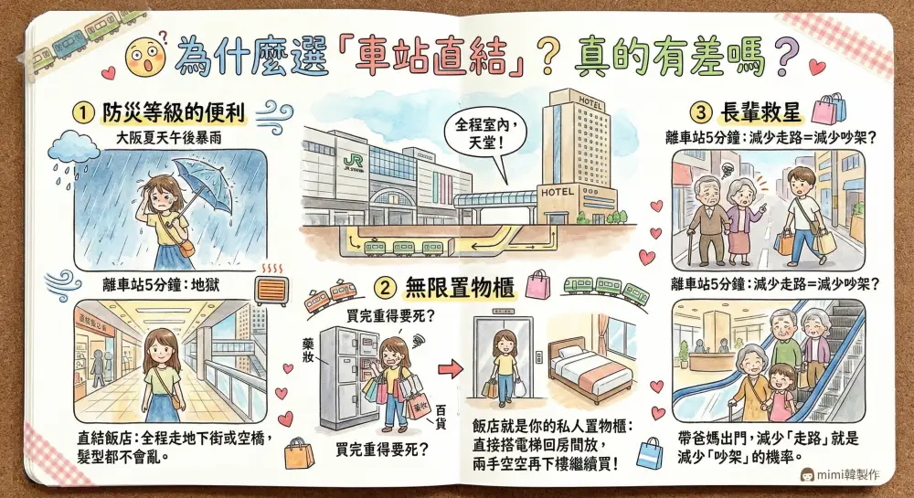 - 防災等級的便利:大阪夏天常有午後暴雨,冬天有冷風,直結飯店讓你全程走地下街或空橋,髮型都不會亂。