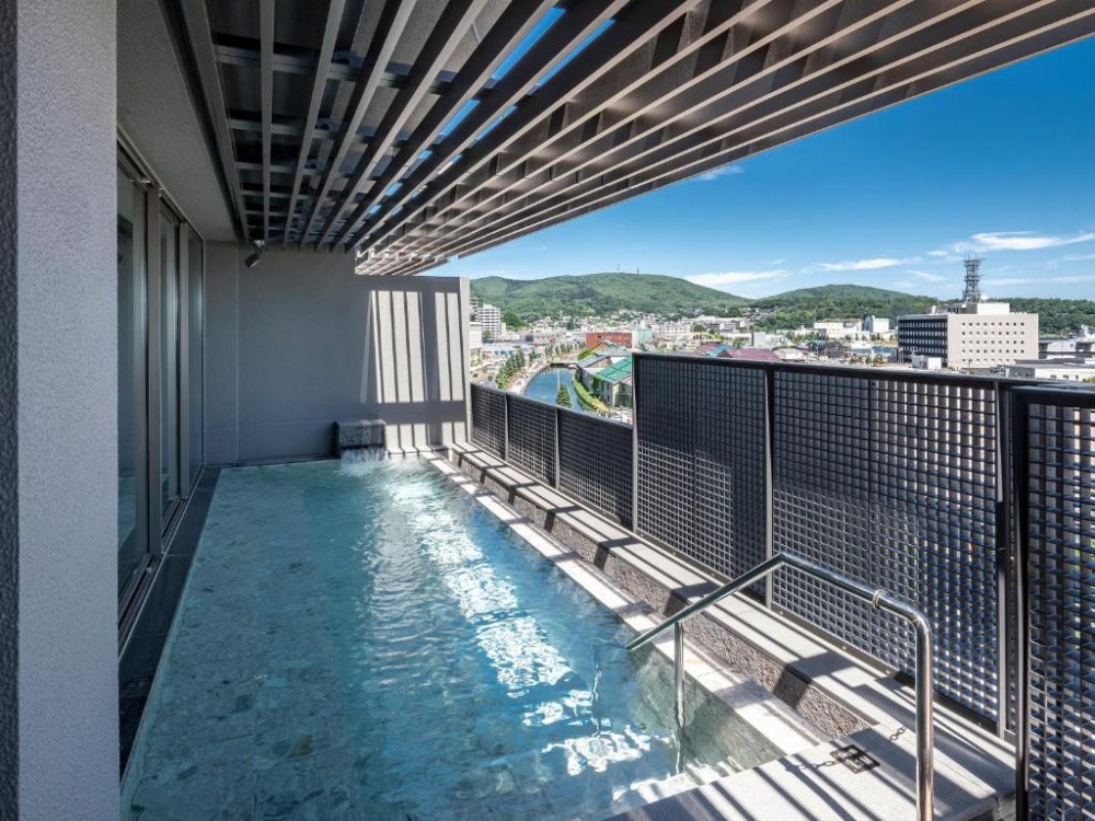 小樽格蘭貝爾飯店 (Granbell Hotel Otaru) 2018 年開幕的設計旅店,距離小樽運河走路大約 5 分鐘。它的外觀非常低調,但內部設計感極強,走的是現代摩登結合工業風。最棒的是頂樓有「天空露天風呂」,可以眺望小樽港灣的景色,冬天飄雪的時候泡湯非常有氣氛。