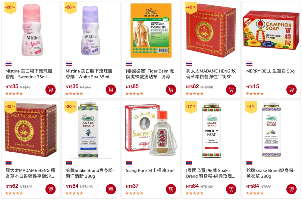 居家生活裡的蛇牌爽身粉、興太太草本皂、八仙薄荷棒、虎標痠痛貼布、虎標萬金油、草本牙膏⋯等也都是大家到泰國時必掃的好物。大家也可以參考之前整理的:30款泰國必買好物推薦