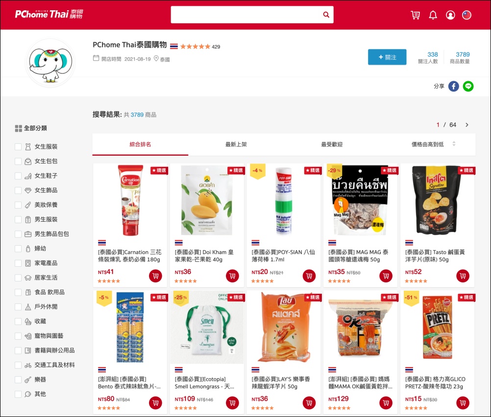 目前PChome Thai泰國購物上共有約3,800種商品,包含各種熱門泰國零食點心、美妝保養、居家生活、男女服飾⋯就連很多人推薦大象包、BKK包都有,而且價格都比直接在台灣買要便宜。