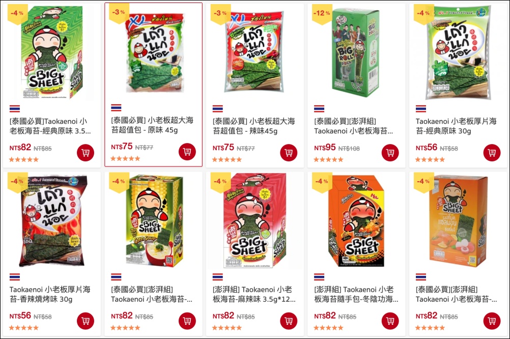 像小老闆海苔我就很愛,比台灣的海苔捲還要好吃,其中最推薦那款一根長長海苔捲,PChome Thai泰國購物買9入才95元,感覺跟當時在泰國Big C賣場差不多。小朋友要吃就選綠色包裝,愛吃辣的話就買紅色。