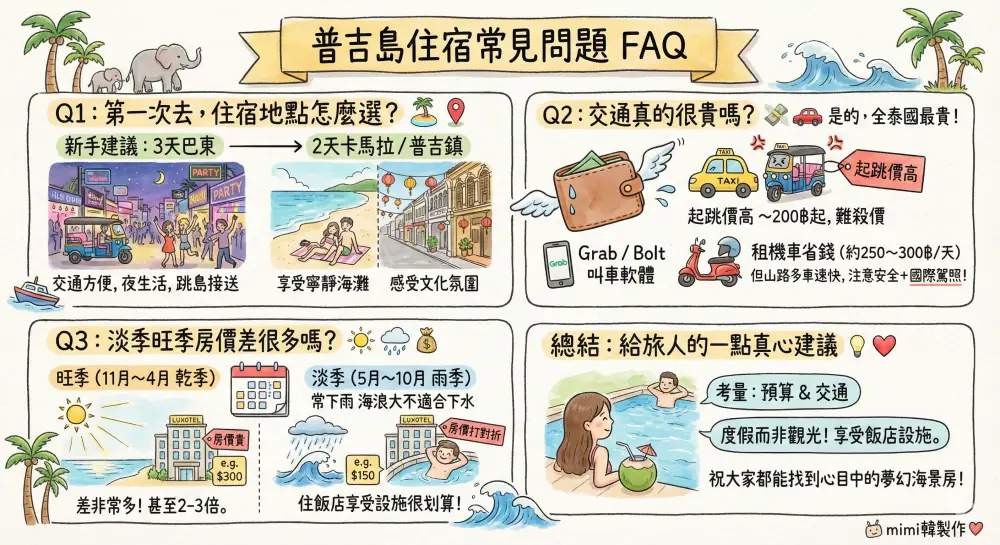 挑選普吉島住宿時,「預算」和「交通」是兩大考量點。不要為了省房錢而住到太偏僻的地方,最後交通費反而花更多。也不要為了住海景 Villa 而全程都在趕路。 建議把普吉島當作一個「度假」而非「觀光」的地方,選一間喜歡的飯店,花一整天躺在泳池畔喝椰子水,那才是普吉島最迷人的打開方式!祝大家都能找到心目中的夢幻海景房!
