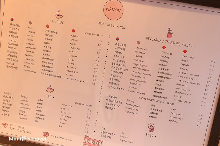 菜單很貼心的用可愛的字體寫著韓文、英文、中文和日文,不會不知道怎麼點,而且價格還用有趣的小數點來呈現(例如6.5=6500韓元),不知道是不是這樣看起來金額比較沒那麼大呢? 😆