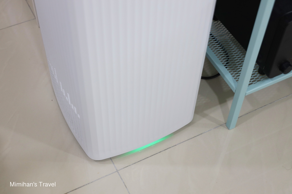 機器底部有空氣狀態燈,綠色=空氣品質優、黃綠色=良好、黃色=中度污染、紅色=重度污染,倒映在地上頗有質感。而且關於燈光POIEMA ONE還有個貼心設計,當開啟自動模式時,如果晚上把室內燈關掉,機器會主動偵測並進入無光舒眠模式,狀態燈LED都不會亮,避免燈光干擾睡眠。