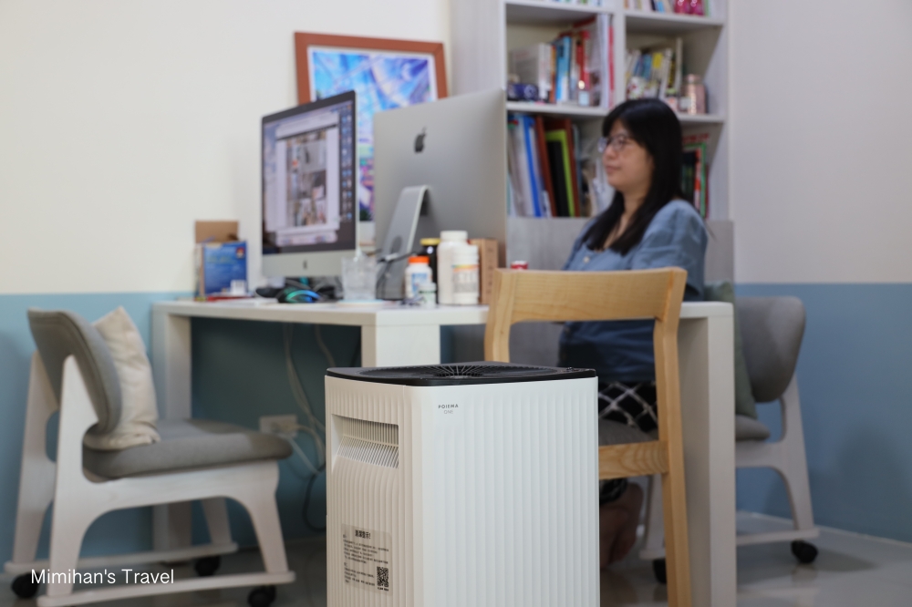 POIEMA ONE出風口設計在機器頂部和上方兩側,排風時的聲音我覺得算蠻小的,數據顯示平常低速/中速使用大概只有25~32分貝左右,屬於睡眠舒適的範圍區間。而且我最近還發現新用途,坐著工作時我就把它推過來當電風扇,出風口高度蠻剛好。