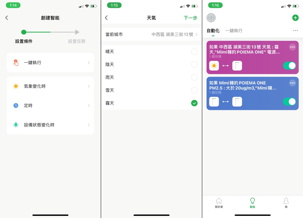 POIEMA APP還能透過創建智能的功能,依照天氣狀況、是否有霧霾、PM2.5濃度超標⋯等各種條件設定運轉模式,例如我們可以設定霧霾天時就開機,或者室內PM2.5數值達到30 ug/m3時就切換中速之類的,根據現場環境狀況做調整,相當有彈性。