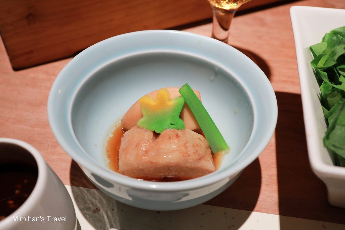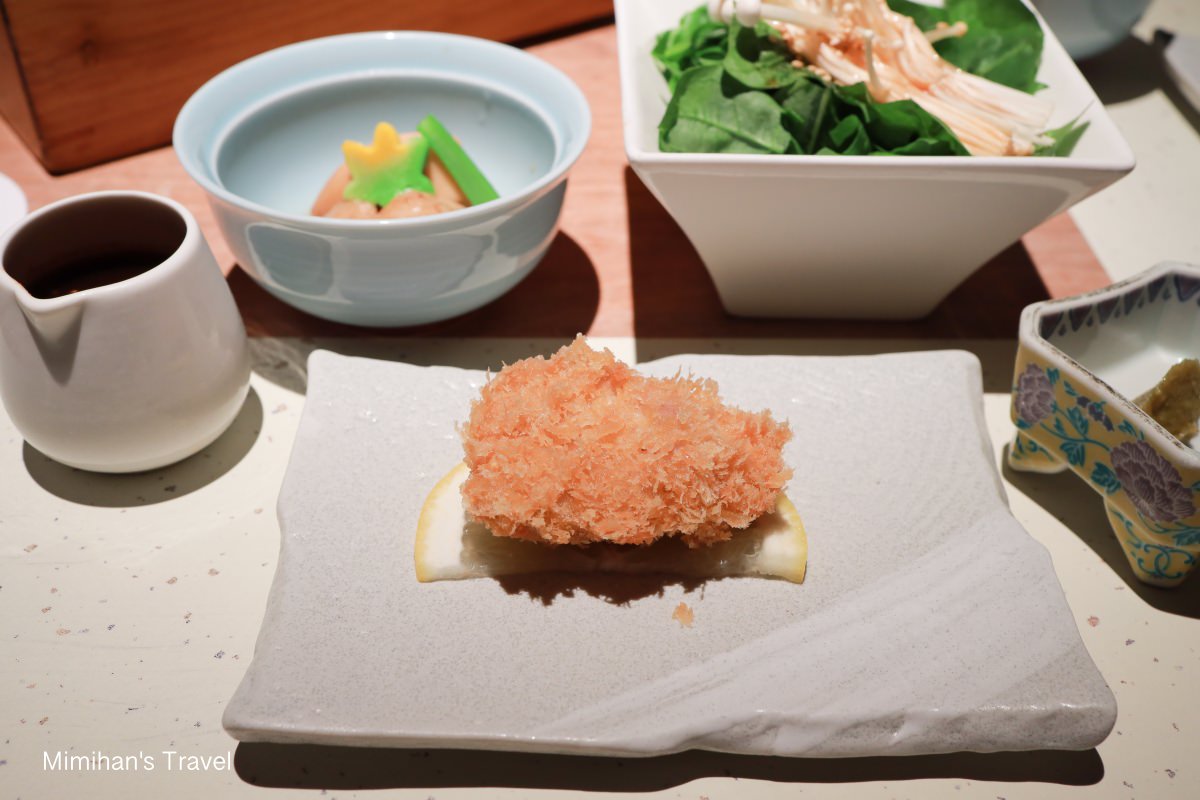 前菜頗精緻,分別是海老タルタル、白子ポン酢、炙燒黑豚,我覺得應該會隨著季節更換菜色,因為跟KKday上標示的菜單不一樣,都還挺好吃。還會附上生菜沙拉,不過我個人其實沒有很愛日本沙拉的醬汁,口味都會酸酸的,而且金針菇生吃好奇怪,最後兩個人決定把它放進涮涮鍋煮一煮,日本人看到不知道會不會昏倒 😆