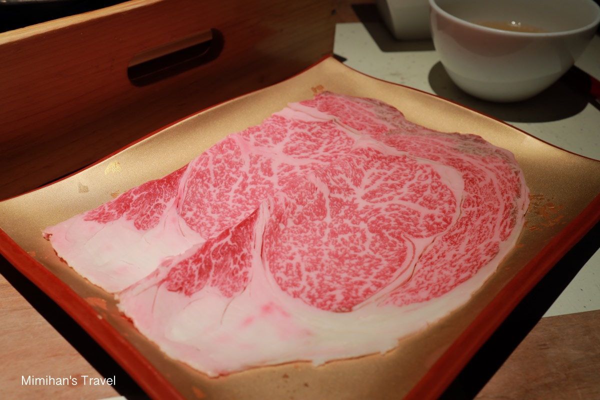 我們這天吃完宮崎霧島黑豬肉的時候就已經差不多飽了,結果後面竟然還有日本和牛肉片,油花分布均勻漂亮,且一整片Size很大啊!