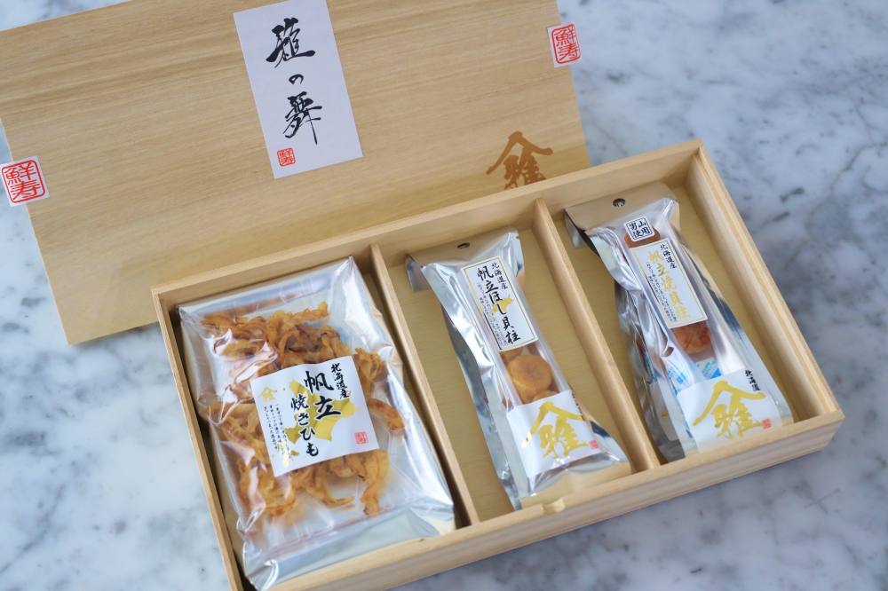 鮮壽雅之舞的烤扇貝絲、扇貝柱、烤扇貝組合,用的是來自北海道的新鮮無污染的帆立貝製作,我們都覺得很好吃而且沒有腥味,外觀用很漂亮的木盒包裝整個相當有質感。