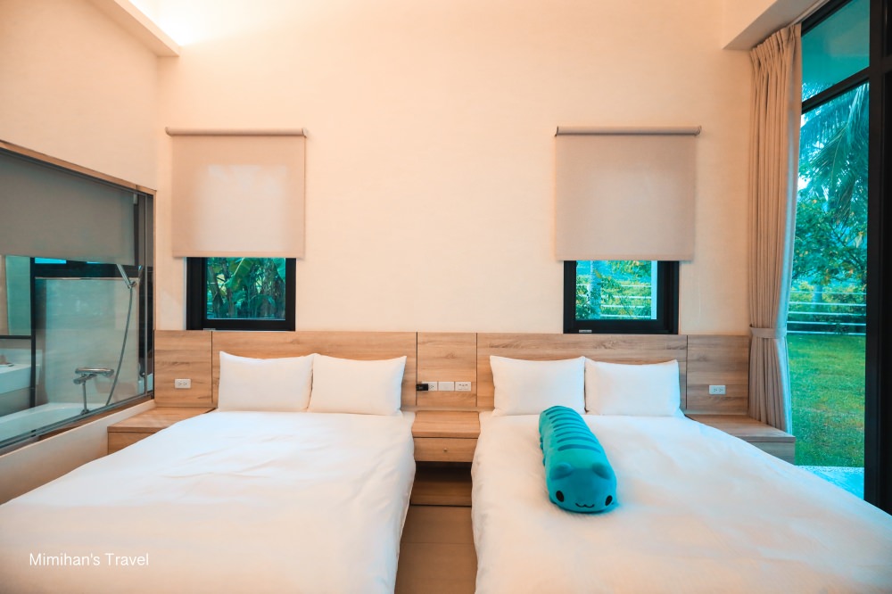 室內裝潢佈置簡約舒適,設備也都感覺蠻新的(那隻藍色的貓貓蟲是女兒帶來的),而且有著大大的雙面落採光我很愛。推開窗戶就能到戶外區去玩耍,不過畢竟富杉晴民宿就是很山林的環境,難免有蚊蟲,房間內備有電子蚊香,也建議大家進出要快點關門,避免打蚊子打整晚唷!