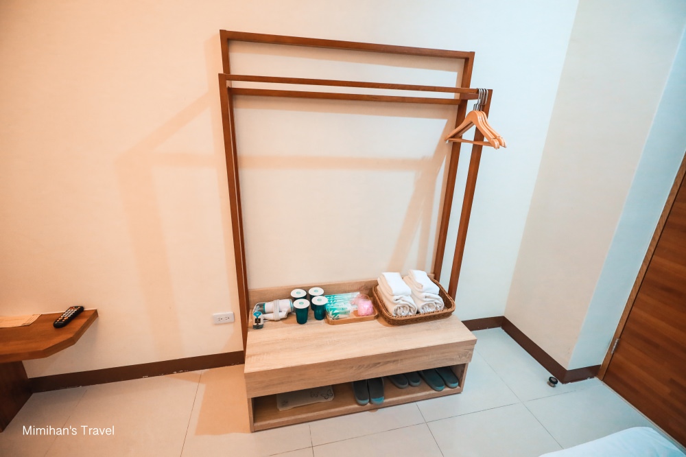 房門一進來是開放式衣架,櫃子上準備了牙膏牙刷、毛巾、吹風機、液體電蚊香等備品,底下則有室內拖鞋、體重機,民宿旅店該有的都有。