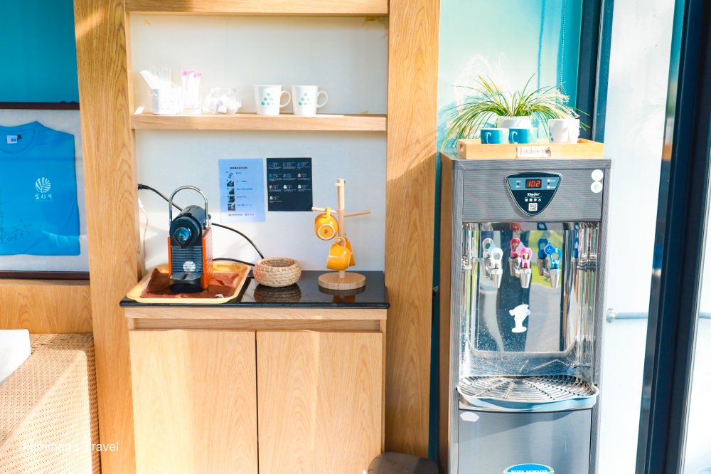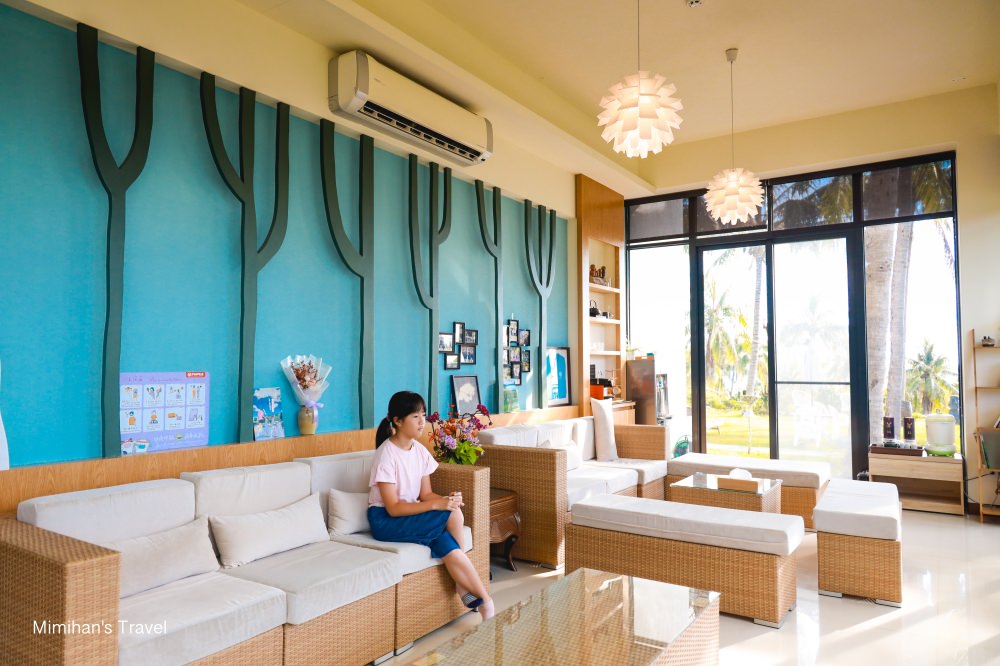 從進入富杉晴民宿範圍開始,兩幢純白色建築被綠色草地、高聳的椰子樹包圍、挺有隱藏在山林裡豪宅的味道。一樓室內是櫃檯與公共空間,提供咖啡飲水等可以自由使用,還有個賣泡麵餅乾的小小誠實商店。
