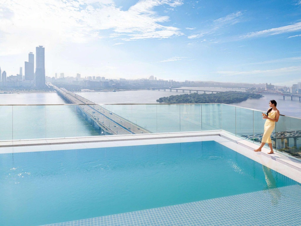 Naru Ambassador Hotel Seoul – MGallery Collection這間隸屬雅高集團的美憬閣系列,位於漢江旁,設計靈感取自水流與自然元素,營造出低調奢華氛圍。館內設有高空泳池、全天候餐廳與藝術感十足的休憩空間,非常符合時下旅人對「質感旅宿」的期待。特別是河景房型,夜晚能直接眺望漢江夜景,十分浪漫。