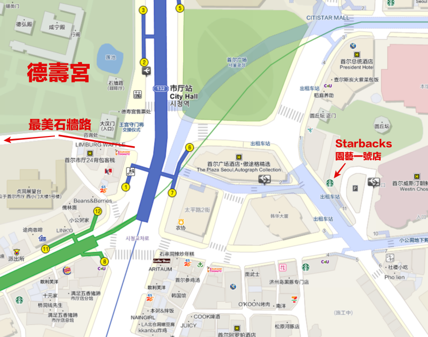 星巴克小公洞店(스타벅스커피 소공동점)就位於地鐵市廳站附近,旁邊是首爾威斯汀朝鮮飯店 The Westin Chosun Seoul(查房價),其實看地圖就知道這附近還有不少間Starbacks,但就只有小公店是有當地特色的門市喲 😆