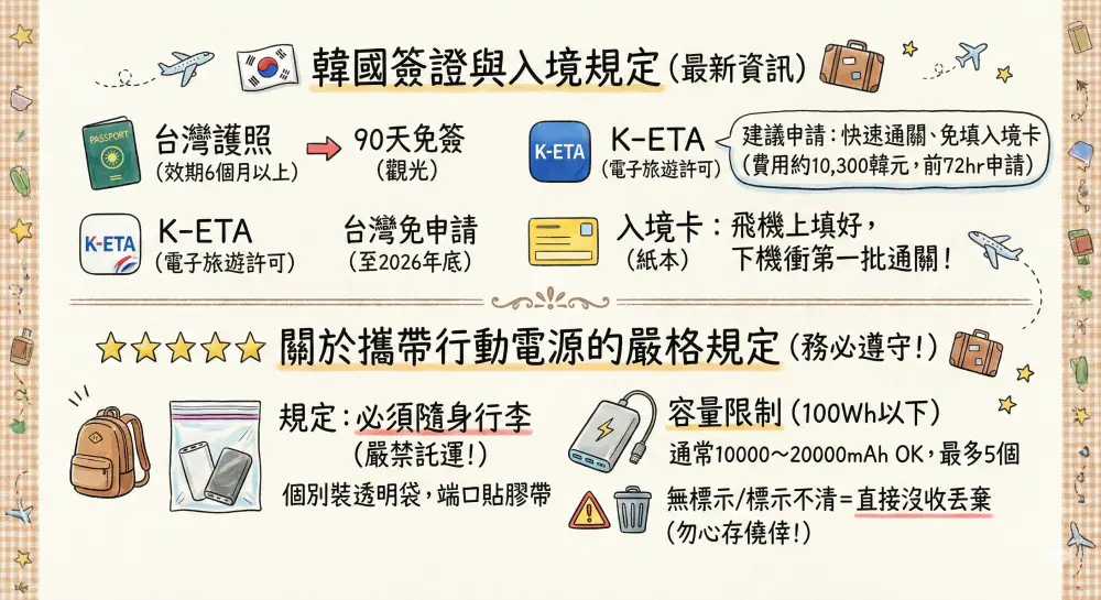K-ETA(電子旅遊許可):台灣旅客目前(至2026年底)入境韓國免申請K-ETA,可以免簽方式入境。但我個人還是建議去申請,主要是可以享受快速通關並免填紙本入境卡,費用約10,300韓元,可在出發前72小時於K-ETA官網或App申請。