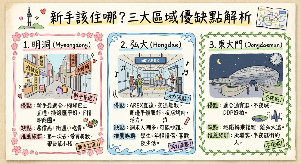 - 缺點: 地鐵轉乘線路較複雜,且距離弘大等西邊景點較遠。