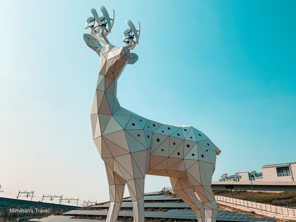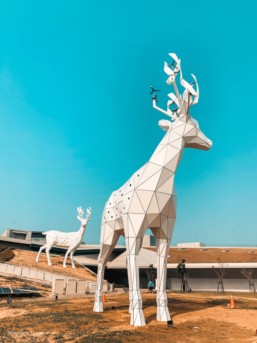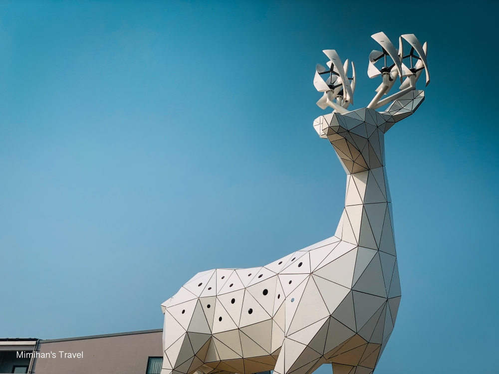 而這兩隻造型優美的大白鹿絕對是綠能科技示範場域最吸引人打卡的景點啦!站在白鹿旁邊人整個就嬌小起來,而且牠們的角一直在旋轉,聽現場工作人員說是風力發電裝置,既壯觀又可愛呢~