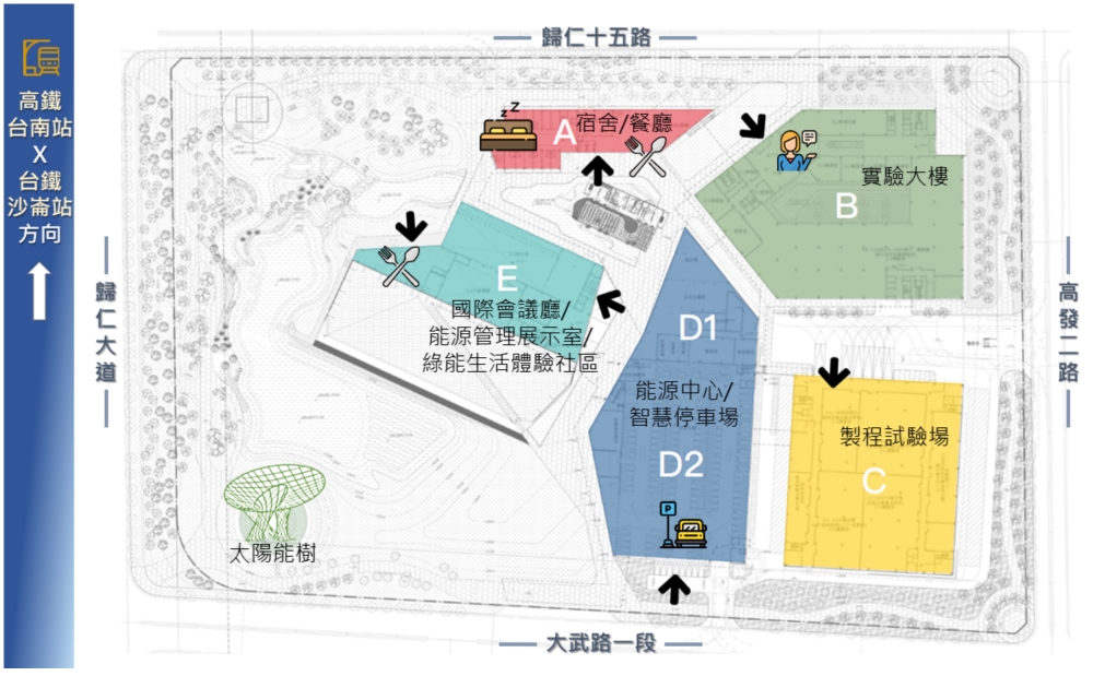 整個綠能科技示範場域佔地面積約7.44公頃,主要就是示範綠能科技,廣場草皮前的「太陽樹」就是以鋼片組件所建構,結合了300W的單晶矽光電板,晚上還會有燈光佈置,把綠能裝置變身成裝置藝術,融入在你我的生活之間。