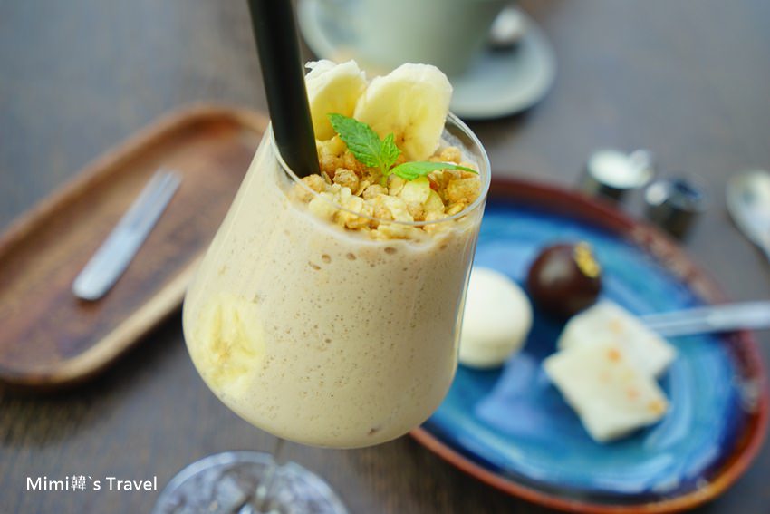 看菜單的說明裡面有香蕉、甘酒、豆乳和寒天水,但其實其實我覺得有點像是香蕉奶昔冰沙,上面加了脆脆的餅乾喝起來口感很不賴,感覺就是一杯健康飲料。