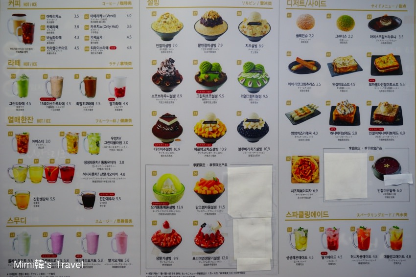 價目表,冰的選擇還不少,招牌的草莓雪冰、水蜜桃雪冰、哈密瓜雪冰、麻糬吐司等都很受歡迎。(價格寫9.9,就是9900韓元)