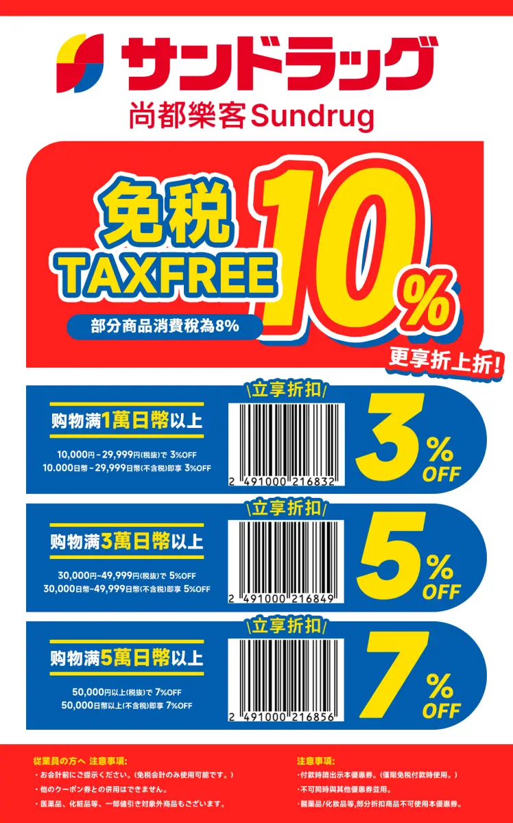 這張Sundrug折扣券僅限免稅付款櫃檯使用,部分已特價商品不適用,基本上觀光客常去的像是東京、大阪心齋橋道頓堀、北海道札幌狸小路等地方的Sundrug分店都會有免稅櫃台,如果是較偏僻的地點則可以事先查詢看看▶︎Sundrug免稅店查詢