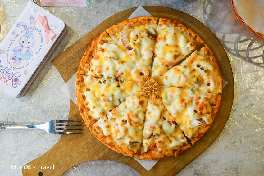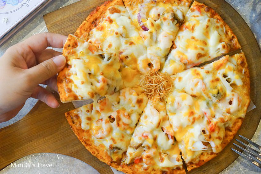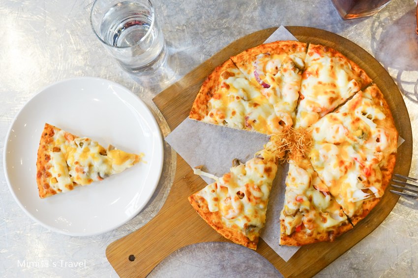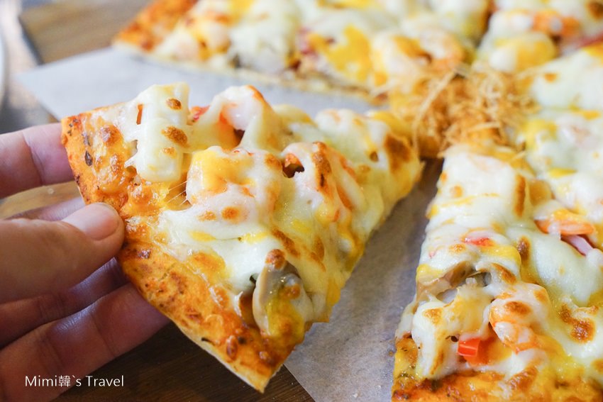 裡面有很多蝦子、花枝、青椒、野菇和洋蔥等食材,整體還滿豐富的,不過咬下去時會時不時有一股生洋蔥的氣味,我們是覺得會讓原本海鮮和起司的滋味都被搶掉,稍微可惜。